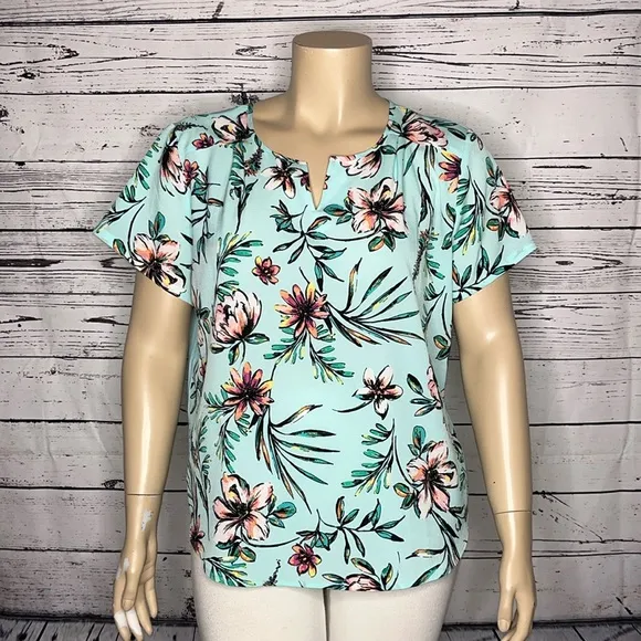 Van Heusen Size XXL Blue - Floral Print Mixed Media Blouse. Split V-Neckline. Cap Sleeves. Front & S... Show more