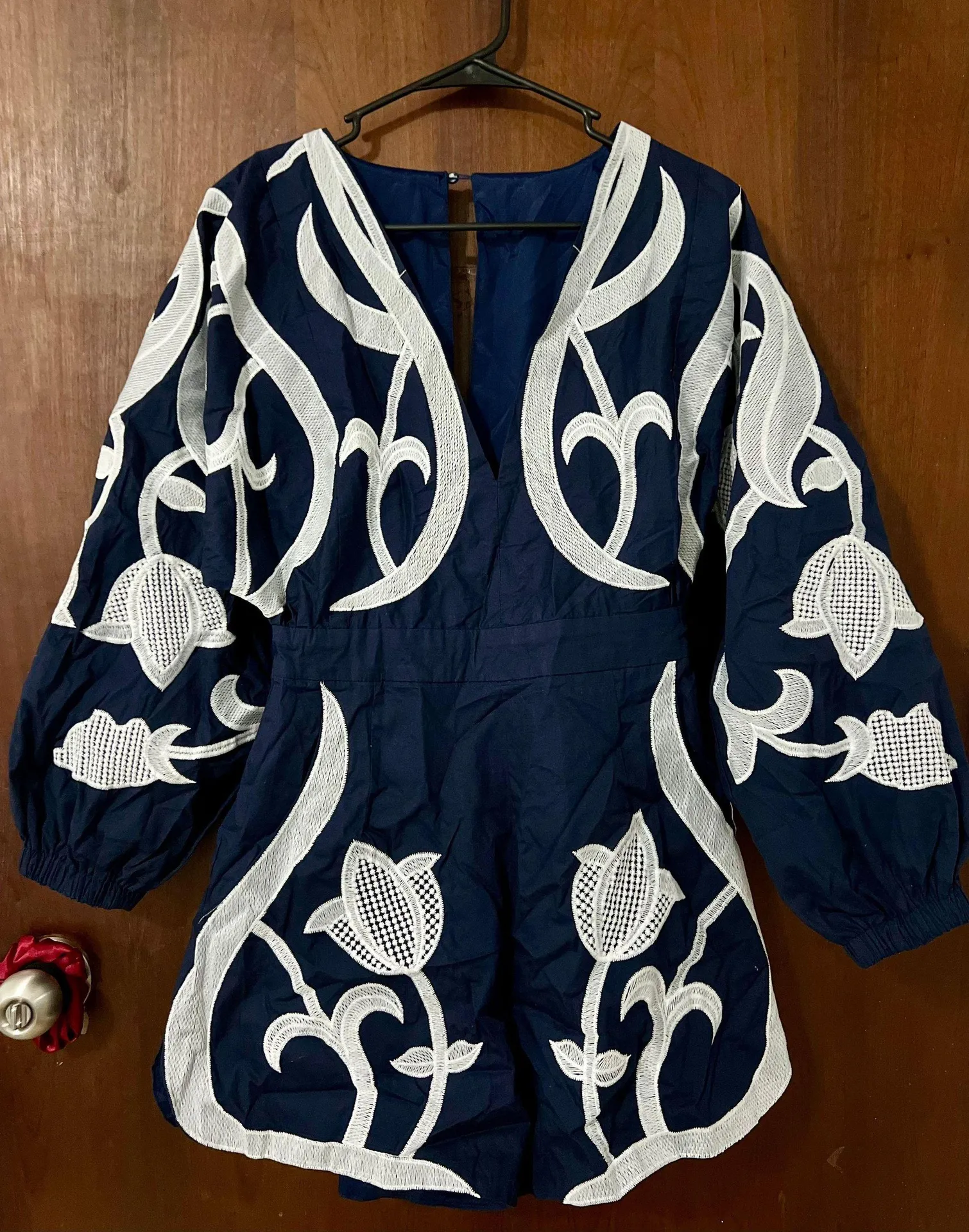 NWOT!!! Mosaic Embroidered Playsuit romper with balloon sleeves and peek-a-boo back. Back zip closure and side pockets Size: M Colors: Blue and White Brand: Black Velvet New without tags! Perfect, not flaws😍