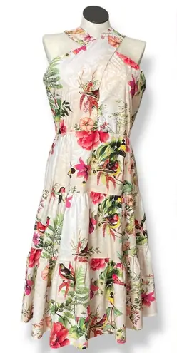 Melonie T women's dress in a colorful floral and bird design against cream and white. Halter tank ne... Show more