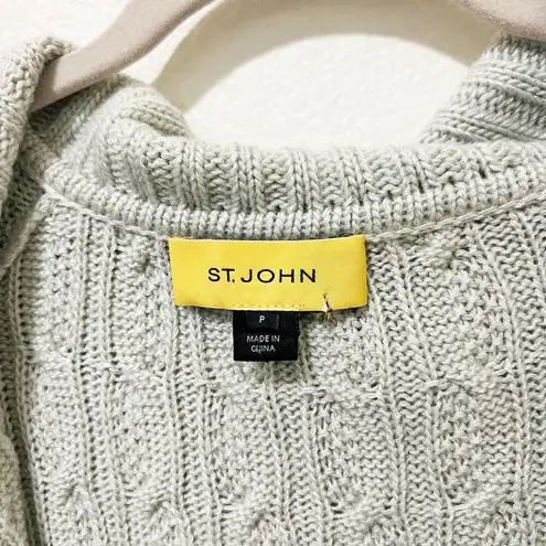 St. John Size Petite P Mint Green Open Front Chunky Cable Knit Cardigan Sweater Good, Pre-Owned Condition Size: Petite Brand: St.John Color: Gray Open front style Chunky cable knit construction Oversized lapel collar Two front pockets 54% Wool, 46% Rayon Measurements: Bust: 19 inches Length: 22 inches