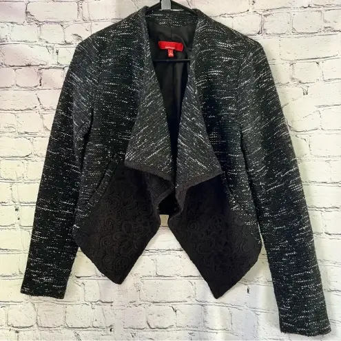 Saks Fifth Avenue red label open front black tweed , short blazer with pockets. It’s a wool blend Be... Show more