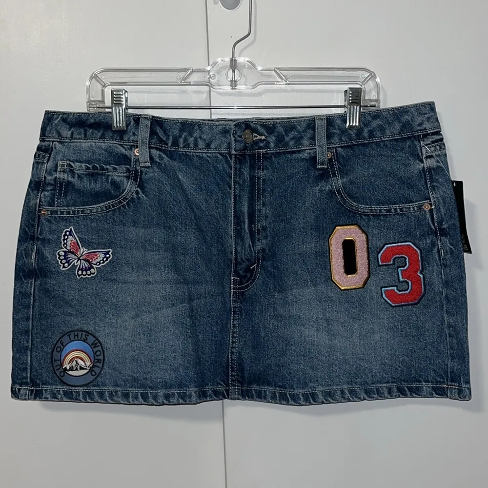 NWT Wild Fable Denim Jean Mini Skirt w Retro Patch’s Women’s 16 Medium Wash. Zip fly, belt loops, cl... Show more