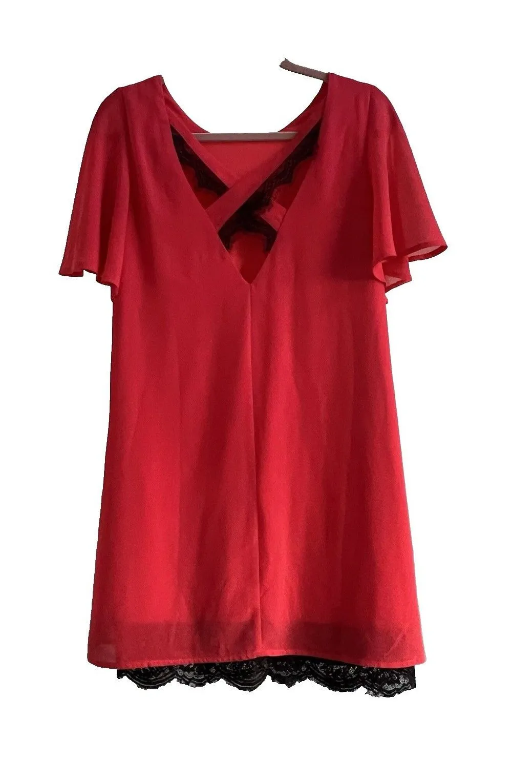 Festive Red Sheath Dress with Black Lace Trim Cross Back Flutter Sleeve Chiffon - $16 - From Sarah