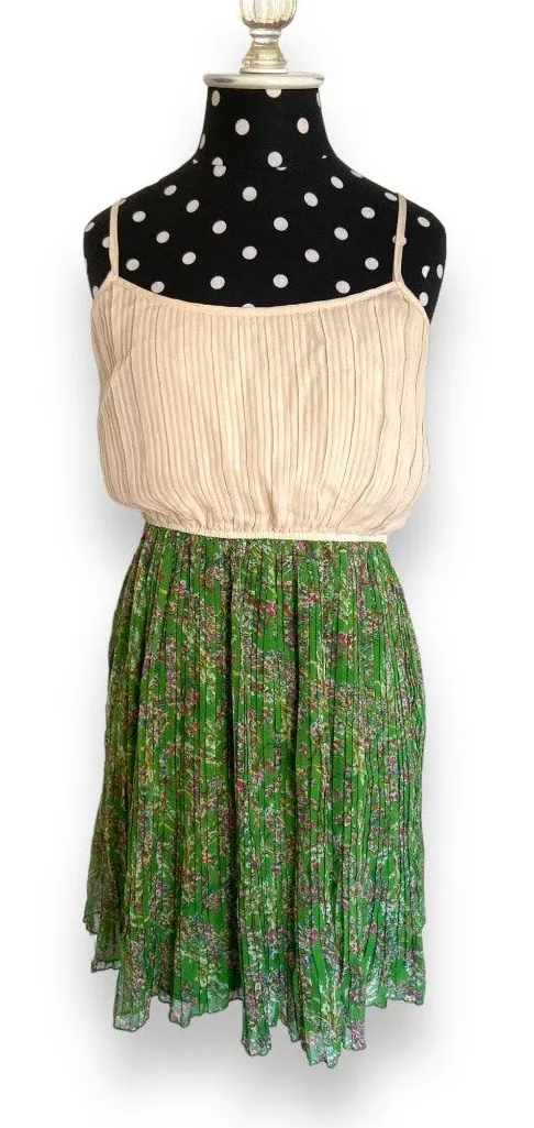 Ya Los Angeles Womens Dress Sz XS Green Floral Skirt Beige Pleated Bodice GENERALLY SHIP SAME OR NE... Show more