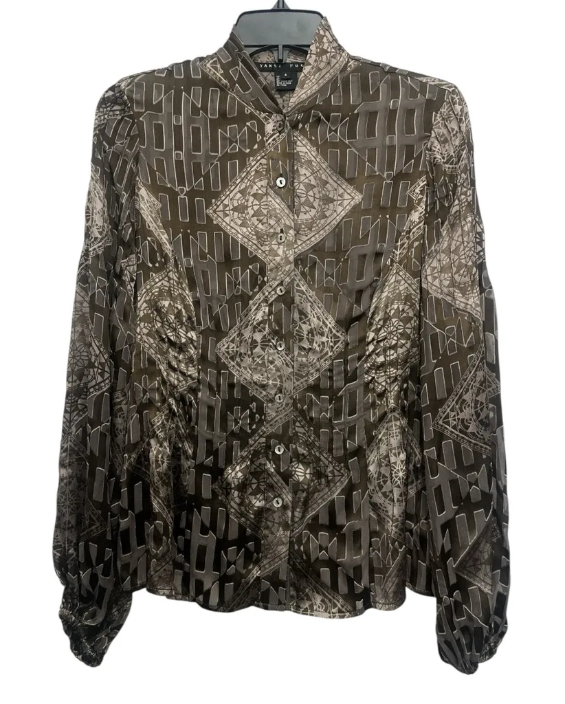 FLAW - there is a small stain on the button placket as pictured and there is some running of the fabric on back sheer boxes as pictured (no holes) Size 4 Pit to pit approximately 18.5” Length approximately 25” Button up Balloon sleeve with elastic cuffs Textured Scarf print 75% rayon/25% silk Dry clean