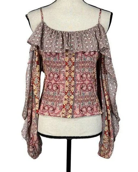 INC Large Cropped Top * Geometric * Smocked * Off-Shoulder with Adjustable Spaghetti Straps * Ruffled * Long Balloon Sleeves with Elastic Cuffs * Stretch * Multicolor ***The fabric care tags are missing. Please check the measurements to ensure a proper fit. Bust: 30" (unstretched) Length in the back from under the arm to the hem: 10 1/2" Measurements are approximate, laying flat and unstretched. Smoke free home. Thank you for supporting our small business!