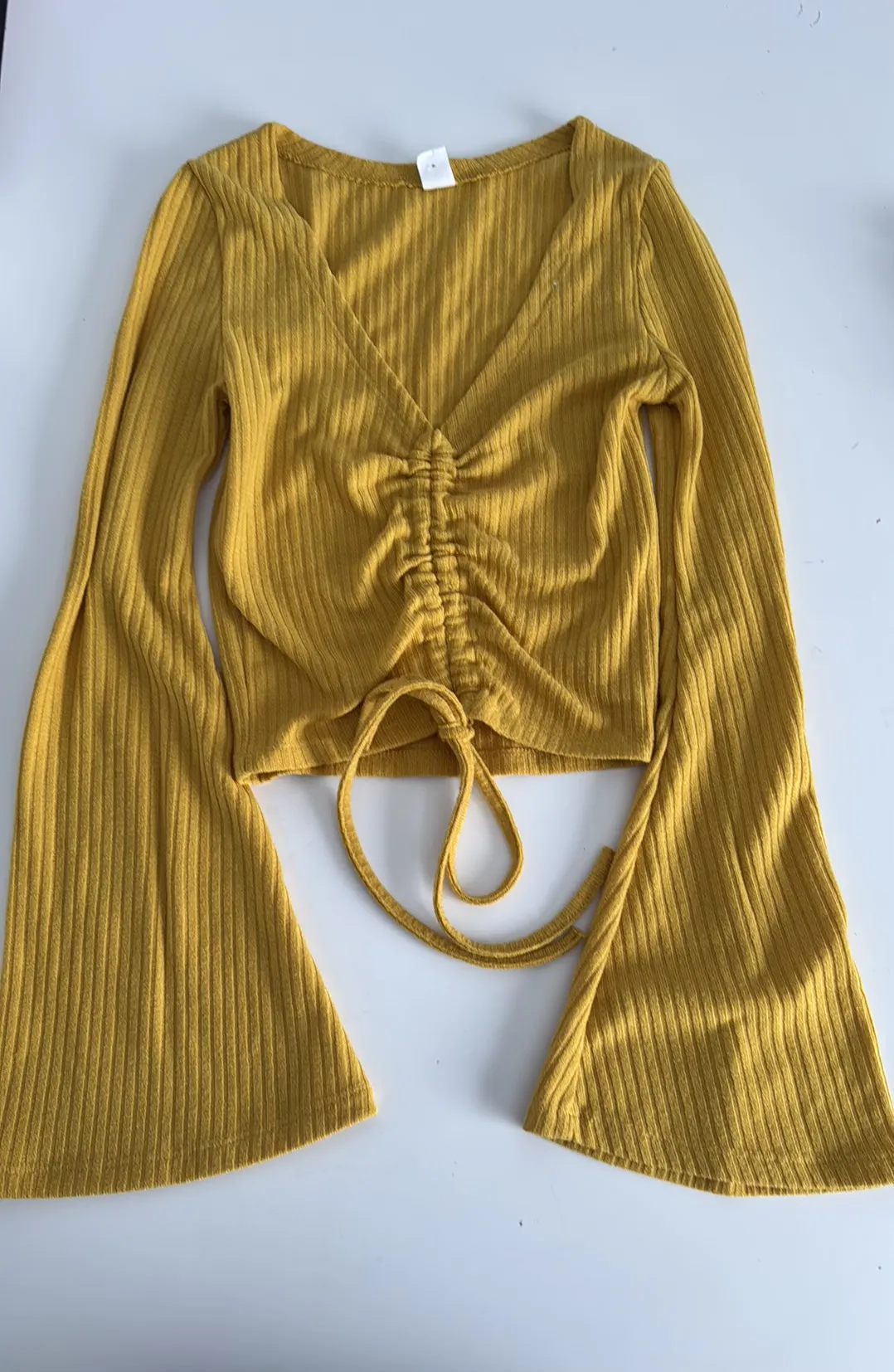 Yellow bell sleeve ruched tied v-neck long sleeve top. Ribbed. XS - $10 - From Rose