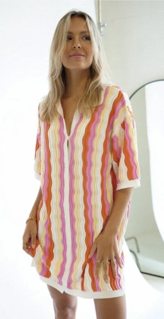 Brand: ytlw Style: Womens short sleeve collared button-up tunic shirt with a relaxed, longer-line silhouette. Color: Multicolor wavy vertical stripes in pink, orange, yellow, and cream with contrast white collar, placket, cuffs, and hem. Size: Womens S/M (S/M on inner size tag). Details: Soft lightweight open knit fabric with subtle textured pattern, short sleeves, flat point collar, and full button front closure. Tunic length hem provides easy coverage and can be worn loose over jeans, leggings, or shorts, or styled as a fun layer for warm-weather and vacation outfits. Retro-inspired stripe design adds a bold, playful look for casual everyday wear.