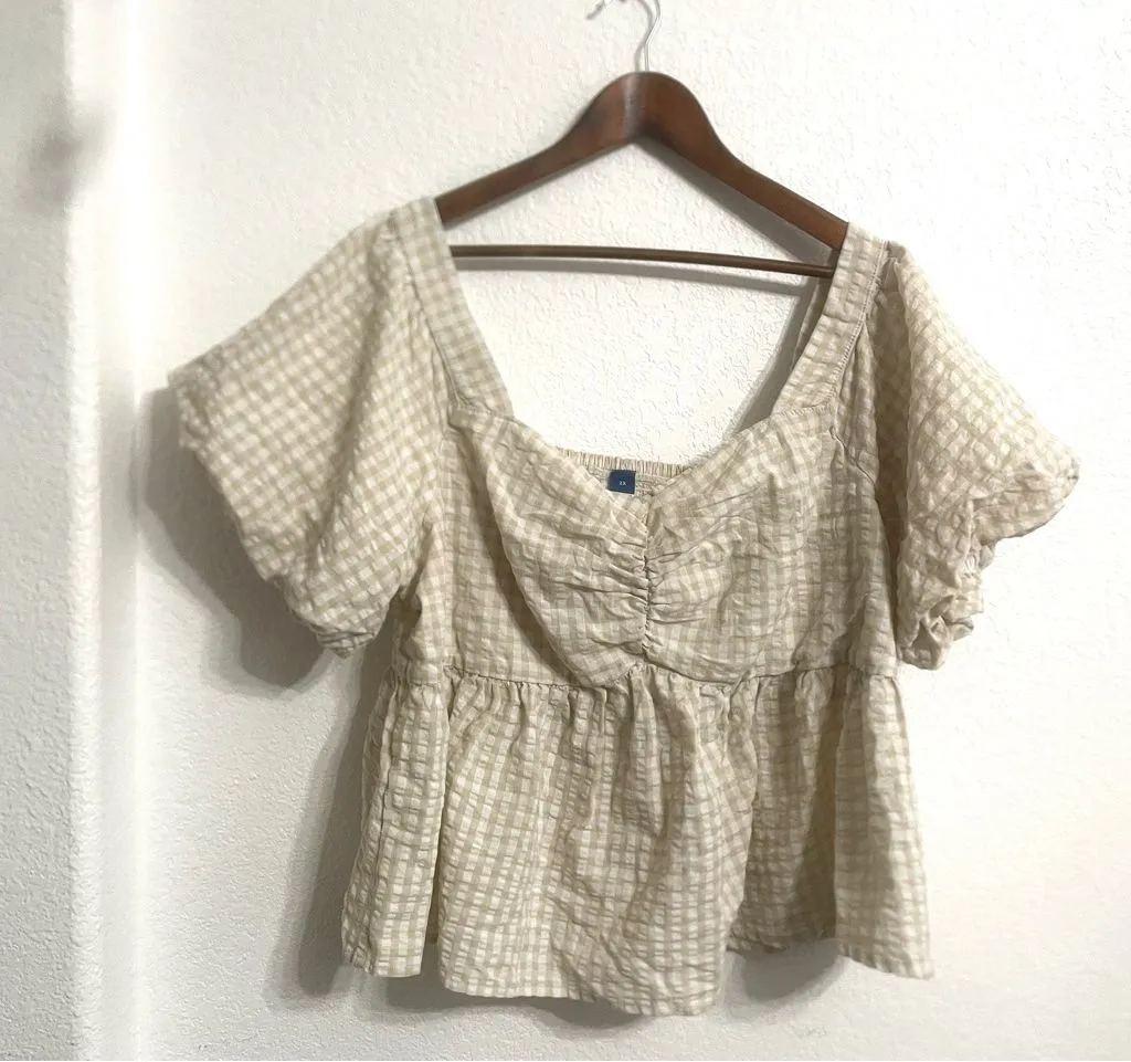 Womens Plus Size 2X Shirt Blouse Cream White Gingham Plaid Short Puff Sleeve Sweetheart Neckline Smo... Show more