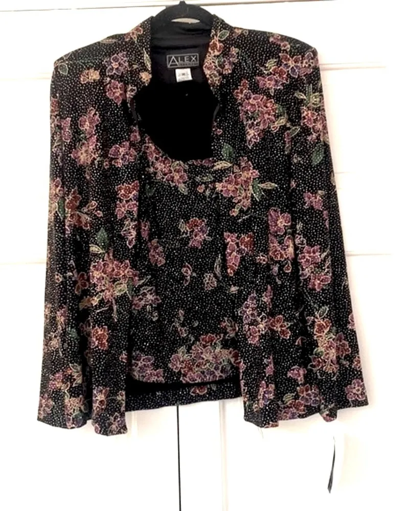 Alex Evenings Two Piece Set New Medium Glitter Floral Fancy Occasion Wedding Gorgeous new with tag with no flaws Alex Evenings set. Black set features floral print with gold glitter accents. Fabric is 90% acetate and 10% spandex for a tailored fit. Blazer has shoulder pads (pictured). Great for a wedding or cocktail event. New with tags womens medium! Flatlay Measurements (approximate) Top Length 23.5 inches Chest 18 inches Blazer Length 27 inches Sleeve from pit 18 inches
