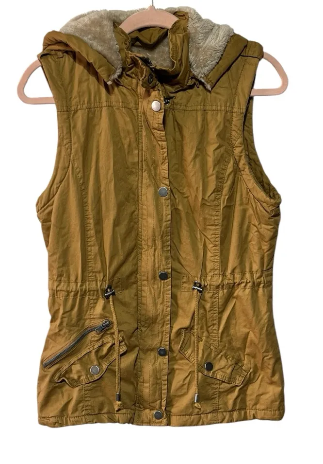YMI‎ COLLECTION (L) KHAKI TAN VEST WITH FAUX FUR, REMOVABLE HOOD SNAP/ZIP FRONT Size L - $16 - From DeDe