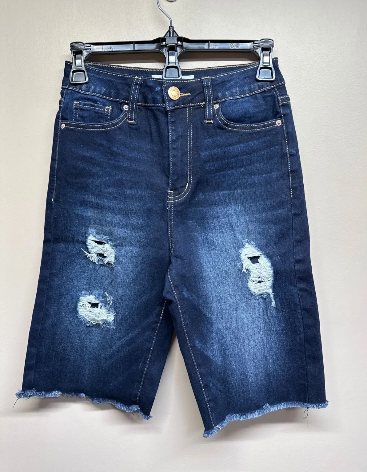 YMI high rise Bermuda denim shorts in a dark wash with distressed detailing and a frayed hem. These... Show more
