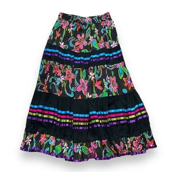 90s Silver Stream Skirt Vintage One Size Colorful black maxi Joyful floral pattern in shades of fuchsia pink blue green and purple Alternating tiers of print and colorful ribbon Comfortable elastic waistband Made of lightweight 100% cotton Flat lay measurements 15 inch waist can stretch up to 16.5 inches 17.5 inch hips 37 inch length Thank you for shopping sustainably with this preloved item A bold piece of art to wear Style with a maximalist bohemian eclectic dopamine aesthetic