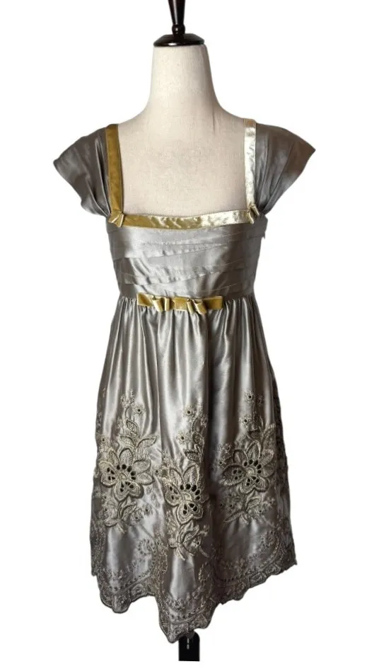 Elegant dress ideal for a special occasion. This knee-length dress showcases intricate floral embroidery along the hem, adding a touch of sophistication. The dress features a flattering square neckline, cap sleeves, scallop hem, and a decorative gold ribbon detail at the waist and shoulders, enhancing its chic design. A perfect choice for cocktail parties, date nights, or a semi-formal event. Silk Blend. Great Pre-Owned Condition (see pics for details) Measurements: armpit to armpit 15.5 in, 33.5 designer, luxury, silk, silky, eyelet, embroidered, women, flounce, ruffle, scalloped, flirty, feminine, classy, party, cocktail, wedding, whimsical, dainty, romantic, mini, boho, bohemian, fairycore, retro, cottagecore, coastal, vintage, classic, sophisticated, elegant,