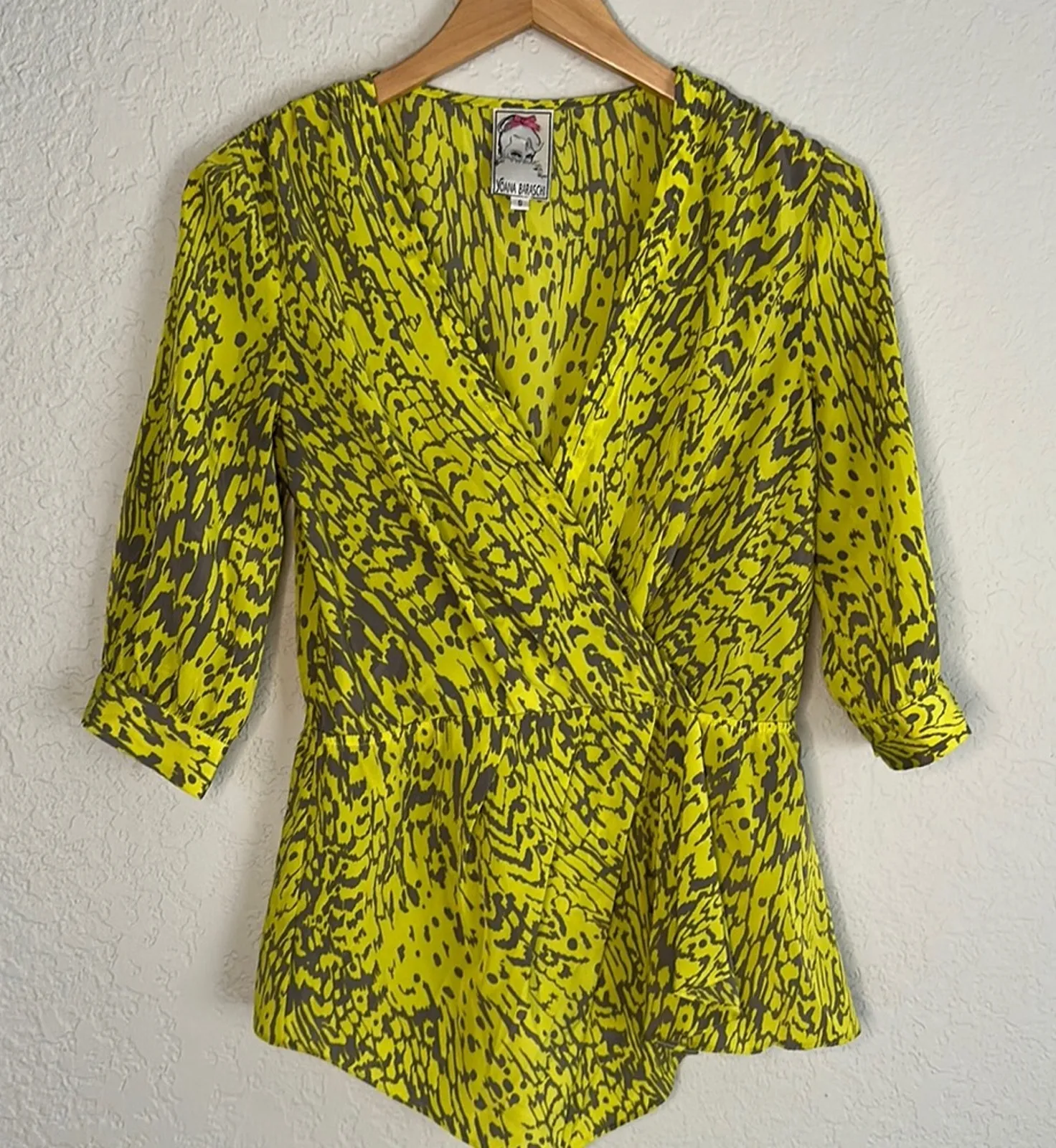 Yoana Baraschi Lime Green Gray Wrap Silky Blouse Size small Elasticized waist with blouson peplum and wrap style front Elbow length sleeve with gold button Excellent condition! Like new Ready to ship to you C2