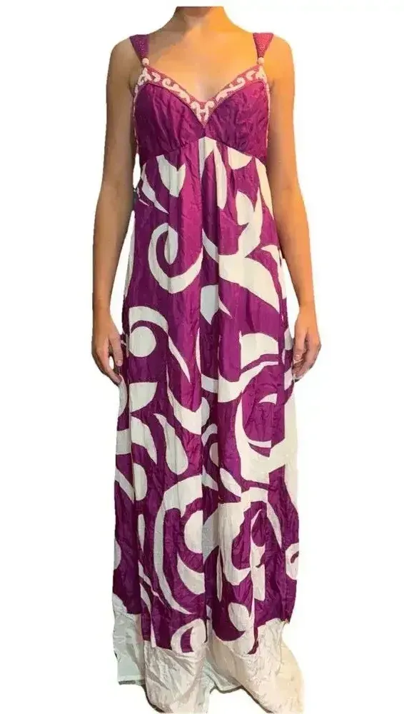 Yoana Baraschi Purple White Designer Luxury Formal Beaded Floor Length Gown with adjustable straps in women’s size Small in good condition; however, the previous owner had glued an extra piece of fabric to the hem to extend the length of the dress. Dress is approximately 43” from underarm to original fabric & approximately 51” from underarm to extended fabric or floor. Please see all photos for MEASUREMENTS & more details as they are part of the description as well. Item shown in photos is the exact item you will receive. Please view all photos for more detailed description. Items come from a smoke free, PUP friendly, scented detergent using household. All items are cross posted.