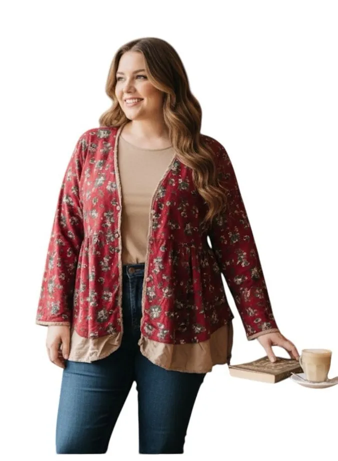 Pre-loved good condition Two soft layers, delicate cotton lace, asymmetrical hem. Burgundy top/cardigan with floral pattern. Features a V-neck and button-up front. Flowy silhouette. Measures approximately: Bust (pit to pit) 27” Length 28”