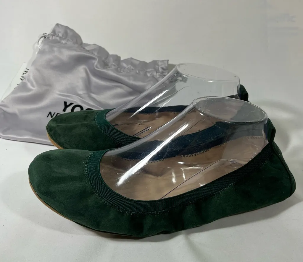 The PREOWNED Yosi New York Foldable Travel Ballet Flats in microsuede green, size 10, are a stylish... Show more