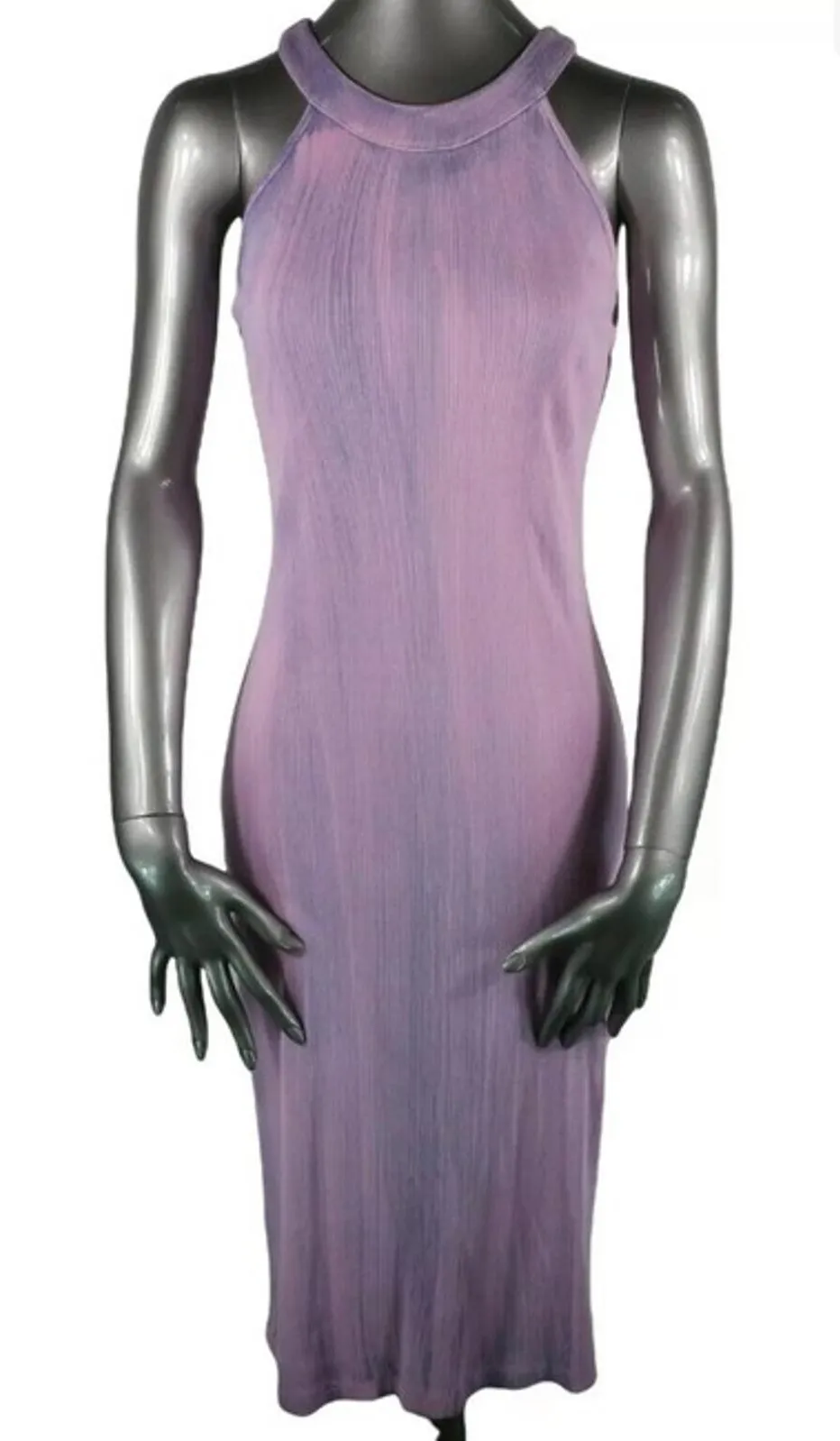 Sleeveless midi dress in a soft purple shade with a unique neckline design. Form-fitting silhouette... Show more