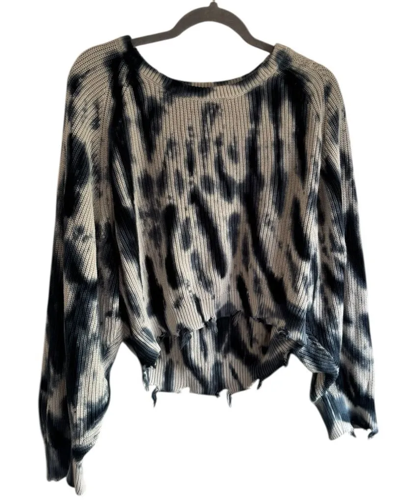 young fabulous broke, yfb sweater, tie dye sweater, distressed sweater, cropped sweater, ribbed cotton sweater, slouchy sweater, raw hem sweater, boho chic top, casual knitwear, coastal style, beachy sweater, loungewear top, black white tie dye, fall sweater, trendy sweater, oversized fit sweater, festival style, edgy style top, comfy knit sweater, soft cotton knit, womens medium sweater, cropped pullover, raw edge top, statement sweater, street style top, everyday wear, unique knit top, indie fashion, relaxed fit sweater
