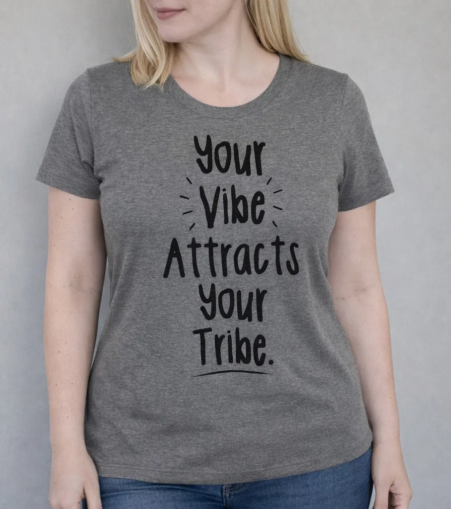 Your Vibe Attracts Your Tribe Graphic T-Shirt – Heather Gray Inspirational Tee ⸻ Description Soft, lightweight heather gray graphic tee featuring the uplifting phrase “Your Vibe Attracts Your Tribe.” Designed for everyday comfort with a flattering, casual fit, this shirt is perfect for laid-back weekends, yoga days, festivals, or anyone who loves positive, meaningful style. Details: • Heather gray short-sleeve T-shirt • Black hand-lettered style graphic • Soft tri-blend fabric feel • Lightweight and breathable • Crew neckline • Casual, relaxed fit • Great for layering or wearing on its own A feel-good tee that makes a statement without trying too hard. ⸻ Tags your vibe attracts your tribe shirt, inspirational graphic tee, positive message t shirt, motivational quote shirt, heather gray t shirt, women’s casual tee, mindfulness shirt, boho graphic tee, everyday graphic shirt, uplifting quote apparel
