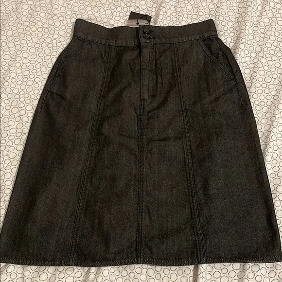 Elevate your wardrobe with this classic dark grey denim skirt. Perfect for any occasion, this skirt offers both style and comfort. Brand new with tag 100% cotton material Front zipper with 2 buttons closure 2 side pockets Waist can fit 27 Hips 38 Length is 23 inch