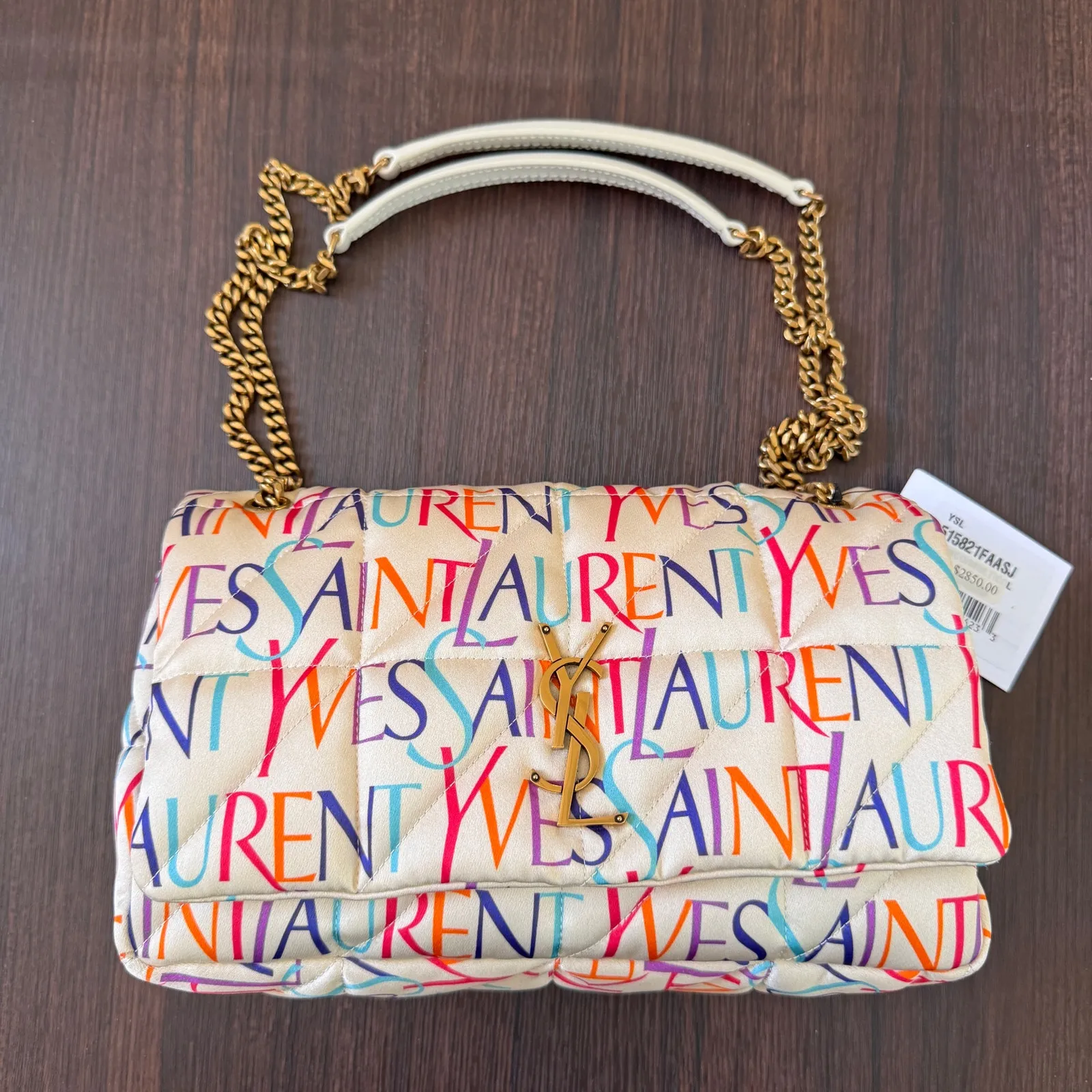 New with tag 100% authentic All sales are final FEATURES Adjustable crossbody strap, 11-21" drop Strap can be worn single or doubled Dimensions: 11.5"W x 4"D x 7"H Snap flap closure Interior zip pocket, interior slip pocket, three interior card slots Allover logo print quilted silk Leather trim details Gold-tone hardware Logo hardware at front Lined Saint Laurent returns and exchanges of full-price merchandise are only accepted online and at Saint Laurent Accessory Boutiques at Bloomingdale's, including 59th St., Roosevelt Field, Century City, Valley Fair, Glendale, and South Coast Plaza. Polyester silk; trim: leather Made in Italy