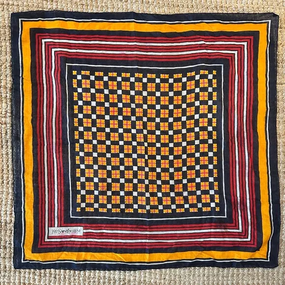 CALLOUTS THERE IS SOME COLOR TRANSFER AS PICTURED. The scarf busy pattern masks this however I want to always disclose Stylish geometric scarf by Yves Saint Laurent. Features bold red navy and yellow design. Adds elegance to any outfit.