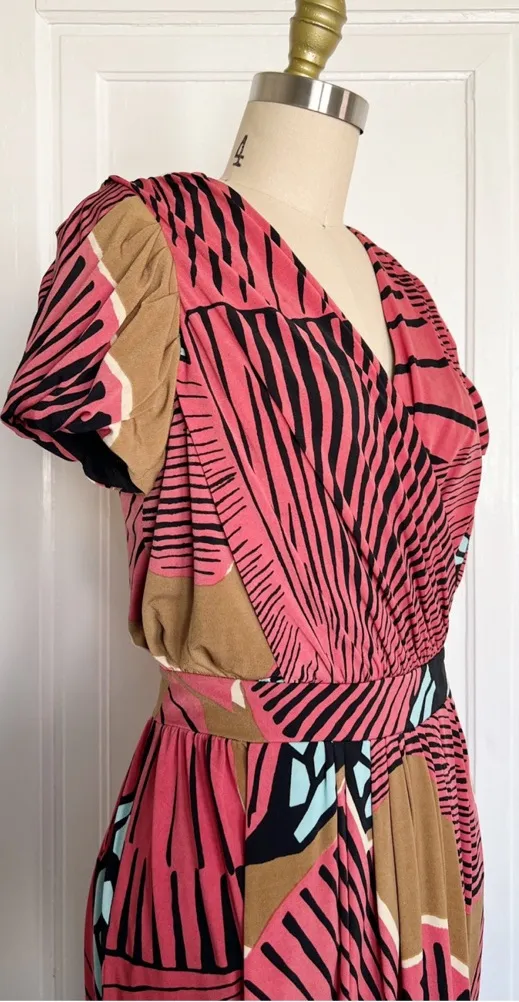 Fabulous cocktail dress by designer Tibi. Knee-length style in tomato red jersey knit with tropical print in brown, aqua, and black. Surplice bust, short sleeves with draped pleat detail, draped skirt with hidden front pockets. Back zip closure. Bust 38-40“, waist 41“, hips 40-41“, front length 34“. Size 8, great preowned condition. All measurements taken with garment lying flat & doubled where applicable.
