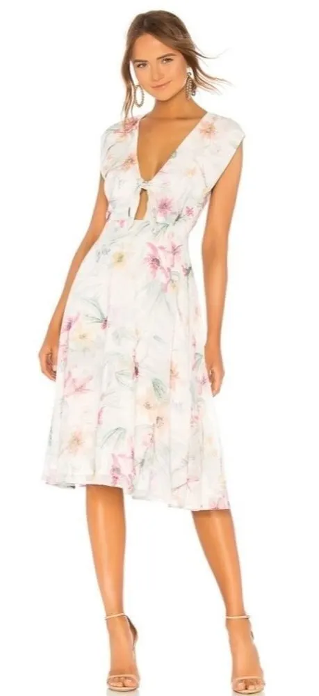 This dress from Yumi Kim is brand new with tags. It is in an ivory color in an allover floral print. It features; v-neckline, front keyhole cut-out with tie detail, Hidden back zipper closure, sleeveless, fit and flare silhouette, midi length, and hidden back zipper closure. It is made from 100% polyester. It is lined. All offers are welcome! ❤️Professional seller, smoke-free home, and same or next day shipping. Like items for price drops. Receive the 15% off bundle discount when you purchase two or more items. Condition: NWT Color: Ivory Material: Polyester Size: S Measurements: armpit to armpit 19 in, waist side to side 13.5 in, length 44.5 in, Floral, Midi, Summer, Fit & Flare, Fit N Flare, casual, classic, floral, colorful, flowers, spring, Fall, vacation, summer, beach, beachy, stylish, trendy, Romantic, Feminine, Pretty, Beachy, comfortable, comfy, dress, bohemian, boho, peasant, midi, Cut out, Sleeveless, V-neck, NEW, NWT, BNWT, S, Small, revolve, Revolve, designer, luxury, cottagecore,