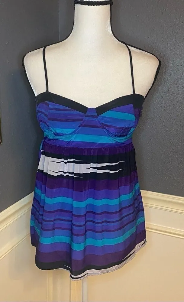 Yumi Kim Julee Balconette Bra Tank Top in a blue purple and black stripe pattern Racer back detailing, under wire bra built in and smocked back provide a silhouette that work for anyone. This is perfect for a night out and to pair with jeans or black pants. Would best for a size C cup Excellent condition