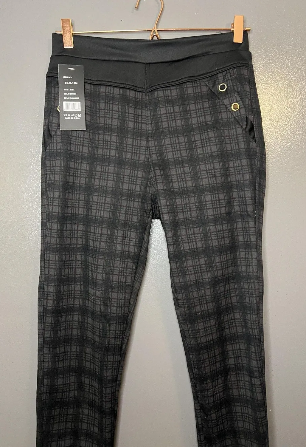 Brand: Yuna Fashion Item: Womens leggings/jeggings Tag size: S/M Color/Pattern: Black plaid Fabric: 65% cotton with synthetic blend (hangtag lists 65% cotton, 35% polyamide; inner tag lists 65% cotton, 35% polyester) Made in China Style features: High-rise wide waistband; pull-on design for comfort Style features: Fleece-lined interior for added warmth Style features: Decorative grommet accents at front; faux front pocket style Style features: Back patch pockets; slim leg silhouette Item/Style code: LY-X-18M Notes: Color tone may vary slightly from photos due to lighting. Waist 27" has stretch Rise 11.5" Inseam 26" bin 14