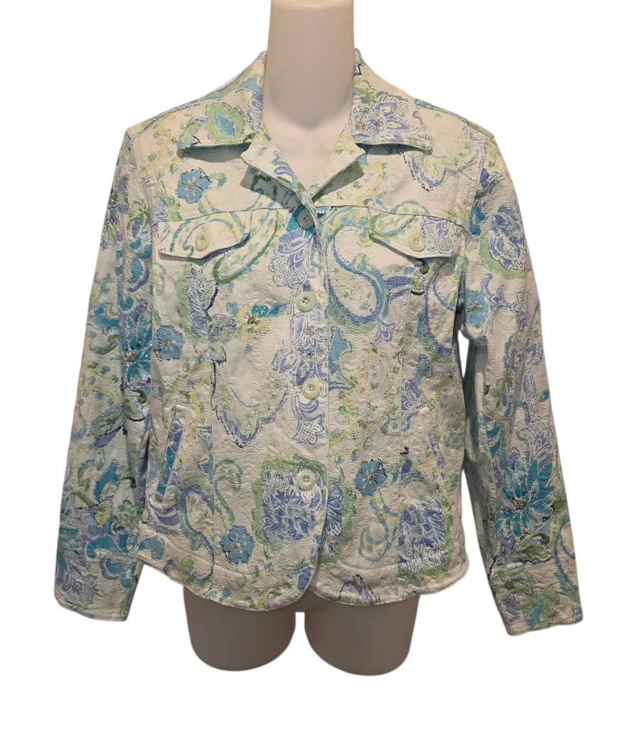 Excellent pre-owned condition. No flaws to note. Women’s Coldwater Creek Vintage Paisley Jaquard Teill Jacket Size Petite Small Ps. long sleeve button up soft pastel greens and blues jaquard fabric collared slant front pockets front flap button pockets Sequin embellished All measurements are approximate Bust 36" ptp 18" Length 22"