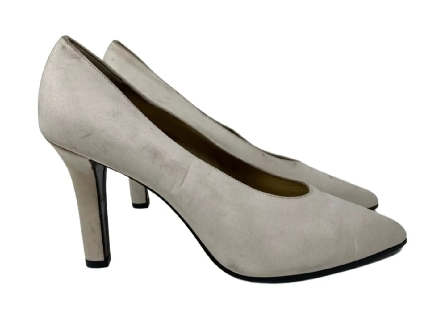 Yved Saint Laurent YSL Vintage 70th Satin Pumps in White size 9 Pre-owned condition. Shows some wear but lots of life left. See pictures for details. Satin need cleaning from wear and dust marks Beautiful Satin Heels Almond toe 4” heel Black leather soles Made in Italy