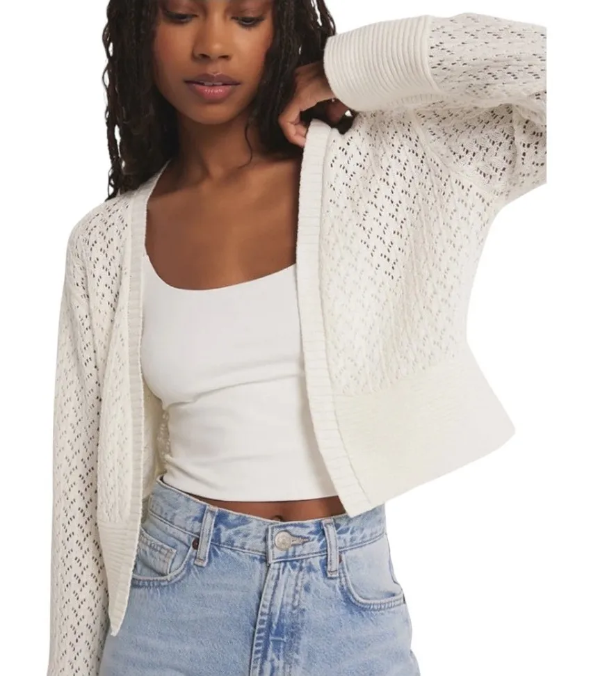 Stylish and comfortable knit cardigan, perfect for layering. This lightweight cardigan features a delicate pointelle knit pattern, wide ribbed trim at the hem and cuffs, and an open-front design, making it easy to slip on and off. A versatile addition to any wardrobe, this cardigan can be worn as a light layer on cool evenings or as a stylish cover-up at the beach.