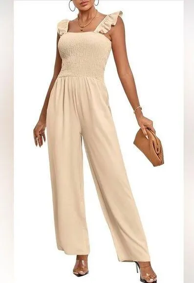 Sleeveless Square Neck Ruffle Sleeve Jumpsuit Wide Leg Pockets (348) Tan Size M - $16 - From Kristine