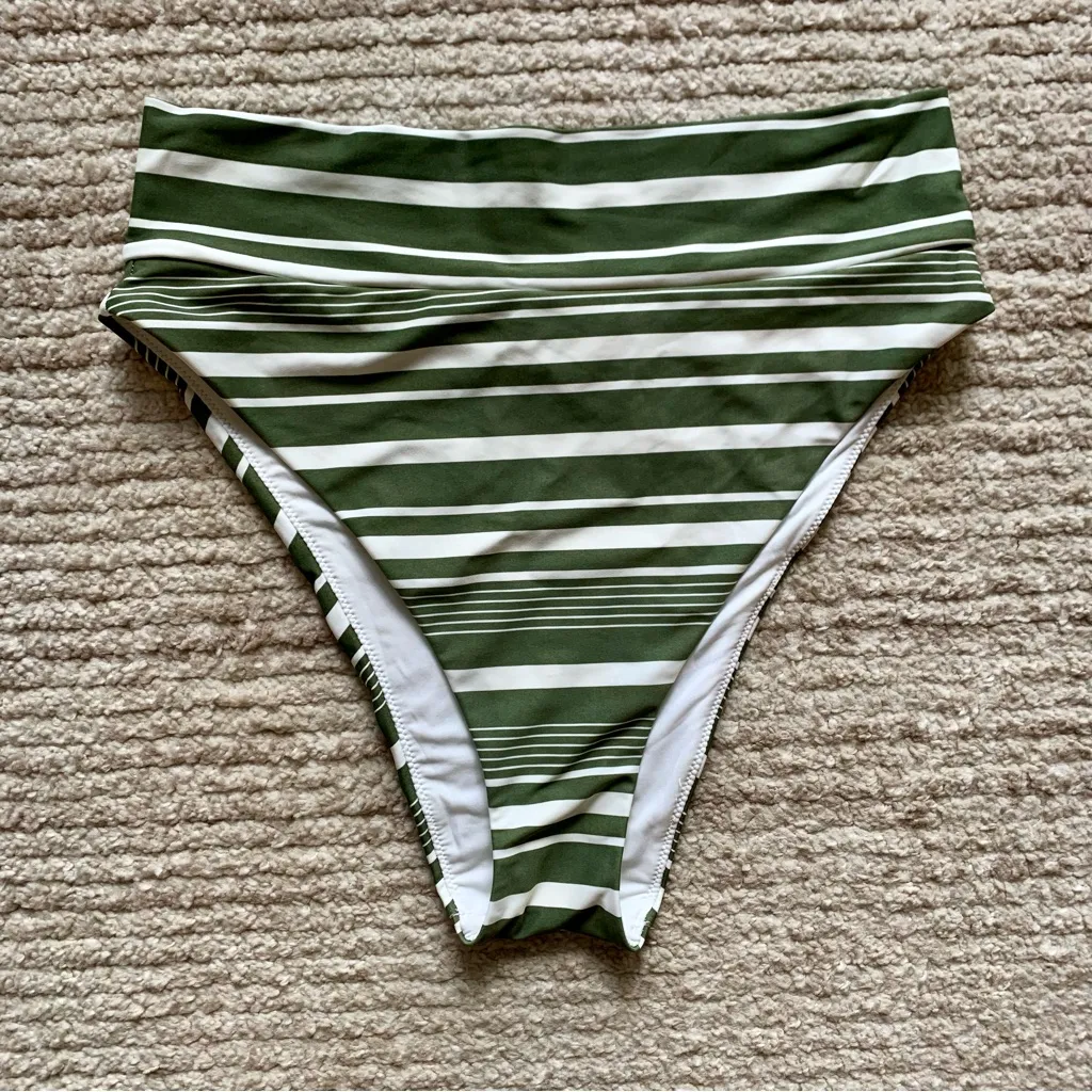 Green and white stripe high waisted bikini bottom, minimal coverage on back. Measures 13.5” across... Show more