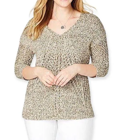 MSRP $89.00 Details: - Crochet knit construction - Deep v-neck - 3/4 sleeves 65% Cotton 35% Polyes... Show more