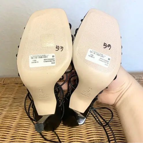 NWT No signs of wear on sole See pictures Excellent condition! A super graphic silhouette defines our Heyde Sandal. Crafted from leather, this statement-making style is detailed with a square-shaped toe, ankle wrap fastening and a stiletto heel. Materials: Faux Leather & Nappa | Cow leather lining | Cow leather outsole Upper format: Strappy Rubber patch at the heel. Heel Type: High Heel Heel Style: Stiletto Closure Type: Lace-up Toe Style: Square toe Counter Type: Open Heel Height: 4.3in | 110mm