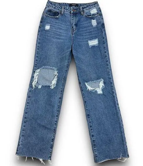 American Bazi women's high rise jeans. Size 5 Medium wash denim High rise waist Distressed / destroyed on the front side with a raw hemline Straight wide leg with a relaxed fit Back pocket is folded over (see pic) 100% cotton Very good preowned condition Lay flat measurements (approx. - not exact): Waist across: 14" Hips across: 19" Rise: 12" Inseam: 31" *Ships same day or next business day*
