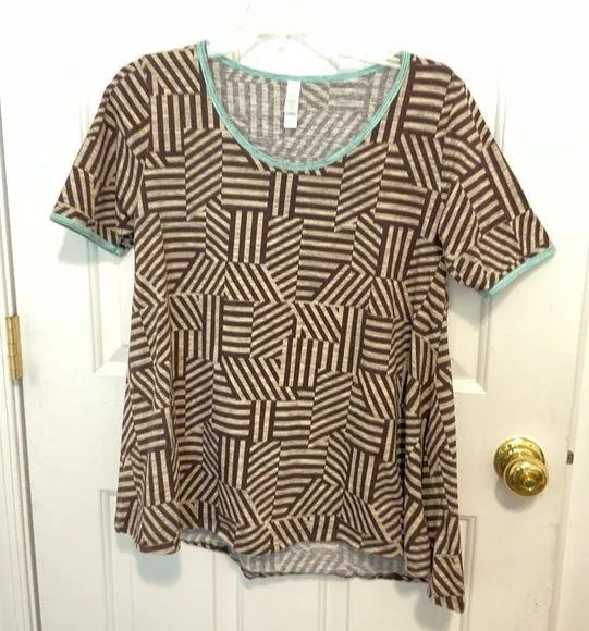 Size small, brown striped print with cream striped print, teal ringer on neck and sleeves, 3/4 sleev... Show more