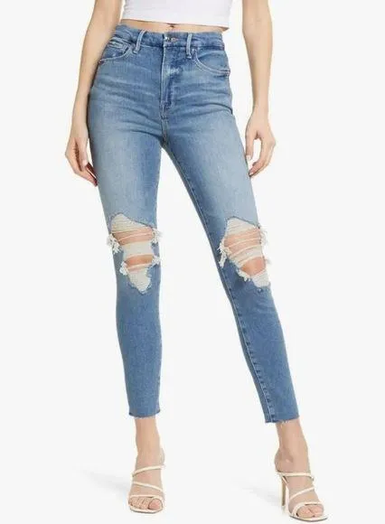 Good American Frayed Hem Distressed Jeans in Indigo Blue, Size 16, New with Tag From the Soft Tech D... Show more