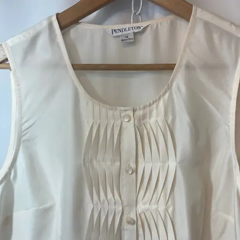 Pendleton Women’s Top Blouse style top Sleeveless / tank style straps Button down front closure Pleated pattern down front placard Round neck Ivory color 100% Silk Size women’s 14 Approx. measurements: Pit to pit: 21” Total length: 28” NEW with tags condition Tags: elegant, luxury, silk, glam, romantic summer, modern, vintage inspired, feminine, light academia, coquette, vintage preppy, classic, classiccore, minimalist, heritage, European, Mediterranean, art deco. PE02
