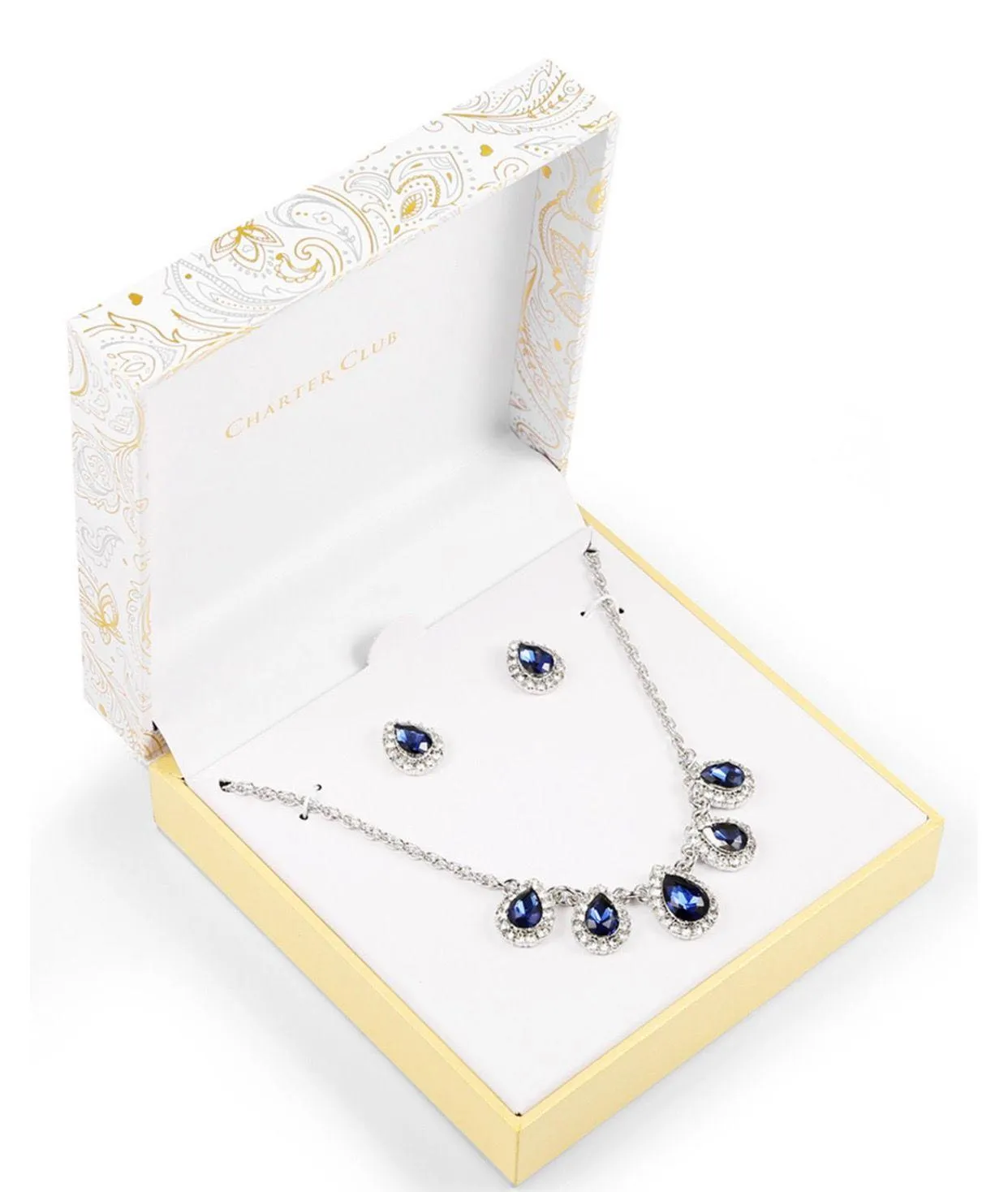 Silver-Tone-Pave & Emerald cut Crystal Cluster Pendant Necklace & Stud Earrings Set. An Emerald Cut Crystal Seats on a Sea of Pave on the Pendant. Set on Silver-Tone mixed metal, glass. Approx Necklace length: 17” + 2 extender, approx pendant drop: 1-1/5”; approx stud diameter: 1/3”. Lobster clasp closure; post back closure. Item comes packaged in a gift box.