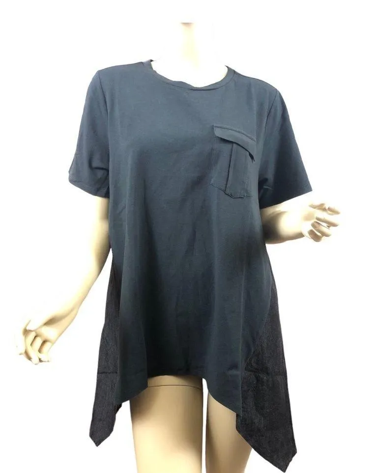 DG2 by Diane Gilman 2-Tone Shark Bite SoftCell Combo Tee with Pocket in Black. BRAND NEW! DG2 by Diane Gilman SoftCell Combo T-shirt Color: Black Material: 92% Cotton, 8% Spandex - with Pocket - 2 Tone front (the back looks like it could be denim) - Stretchy & Soft - Machine washable - Shark Bite Hem 2-Tone Shark Bite Tee with Pocket from: DG2 by Diane Gilman