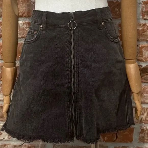 Stylish faded black denim skirt by We the Free. Features front zipper and frayed hem.