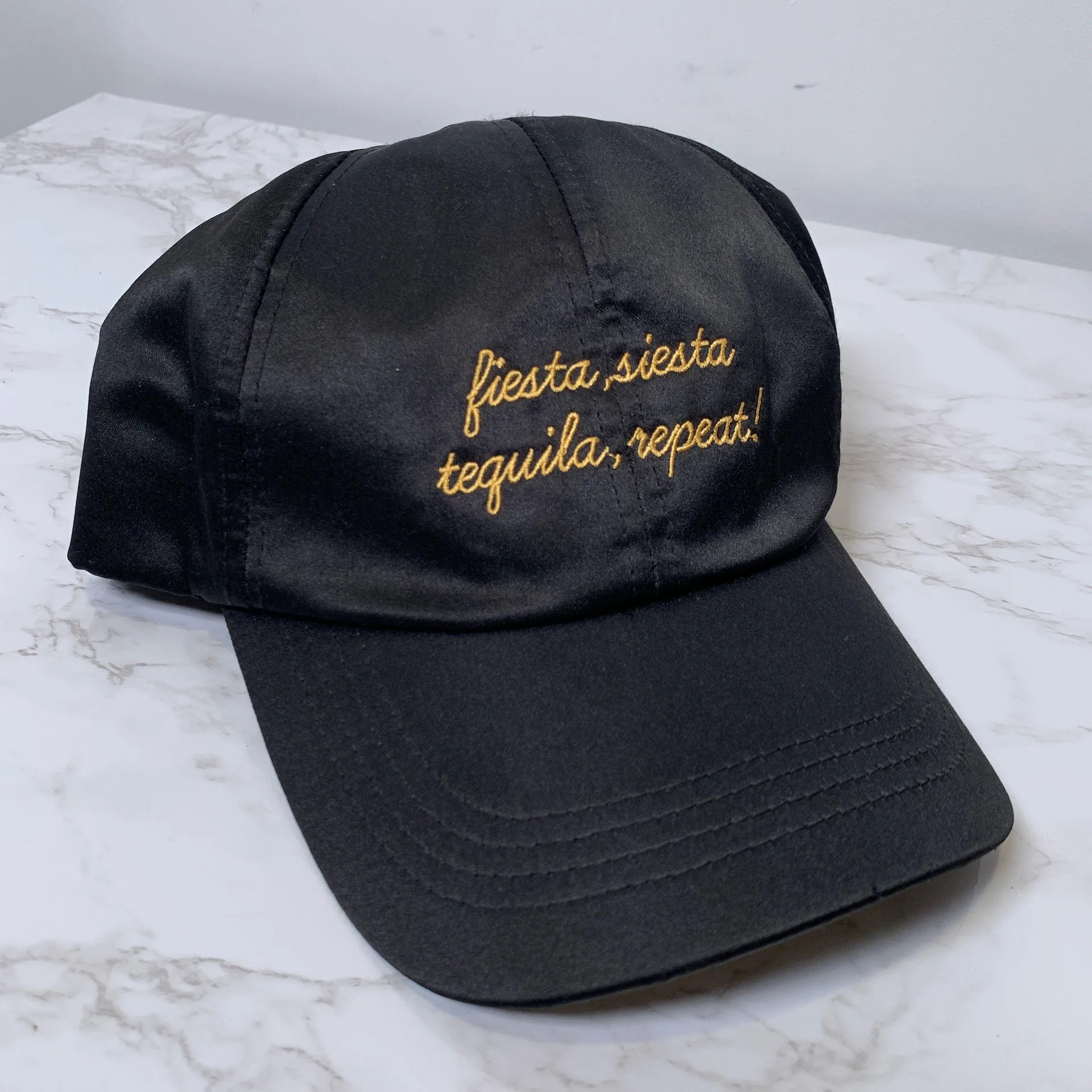 Fiesta Siesta Tequila Repeat Embroidered Black Satin Structured Baseball Cap fun, stylish hat . T... Show more