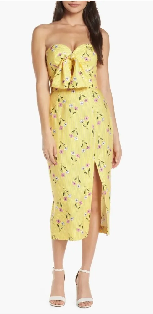 NEW WITH TAGS!! Size: Large Color: Limoncello Dress for the weather you want in this sunny yellow linen-kissed dress with a striped floral print, thigh-high slit and tied sweetheart bodice with coy keyhole. 39" center front length (Medium) Hidden back-zip closure Strapless sweetheart neckline with tie keyhole Back smocking Front slit Partially lined 79% viscose, 21% linen