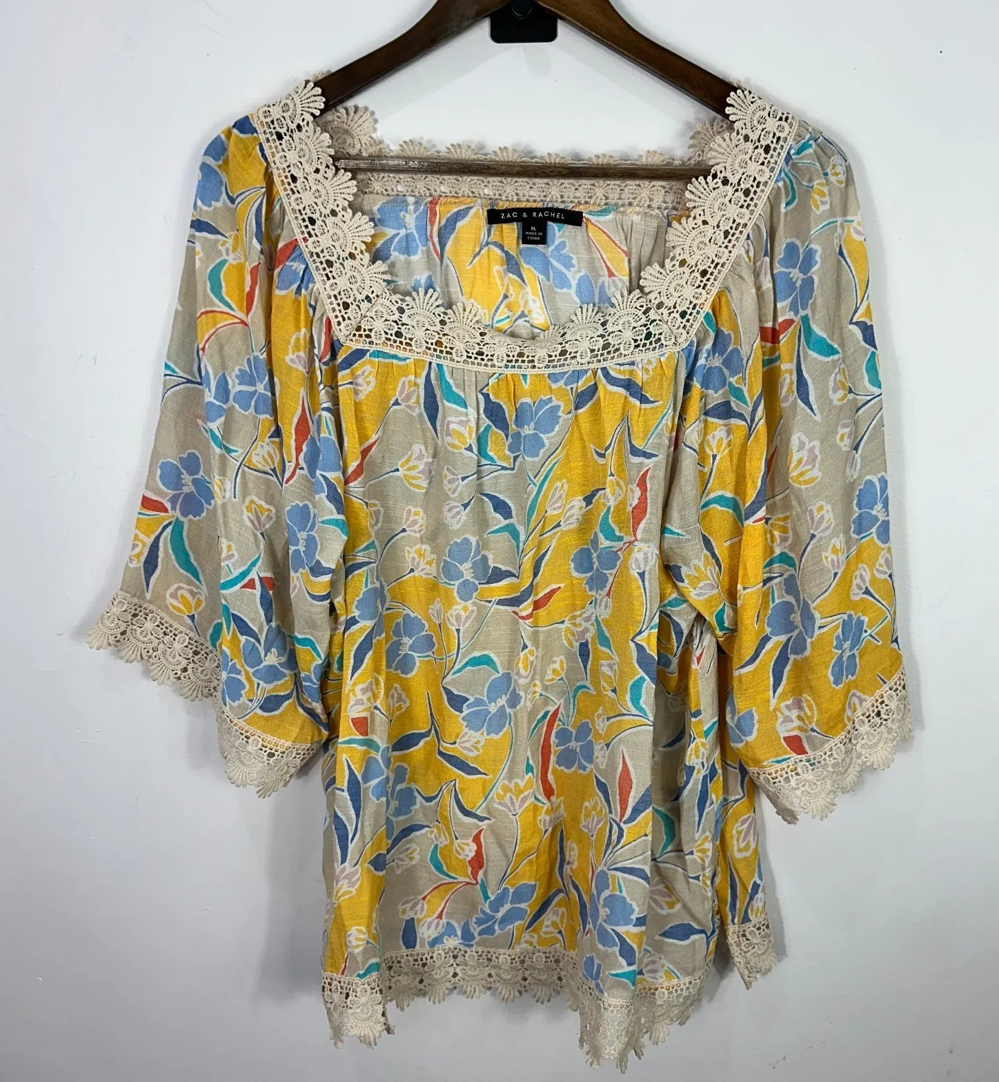 Zac & Rachel Blouse XL Yellow Floral Crochet Boho Peasant Top Cottagecore Size: XL Colors: Yellow, blue, coral, beige Material: 65% polyester, 35% rayon; trim 100% polyester Boho floral print with crochet lace trim Romantic cottagecore / peasant aesthetic Pull-on style, flowy fit boho, cottagecore, romantic, floral, peasant blouse, lace trim, festival, vintage-inspired, feminine, garden party, spring, summer, airy, coastal casual, lightweight #BohoStyle #Cottagecore #FloralBlouse #RomanticTop #FestivalFashiom
