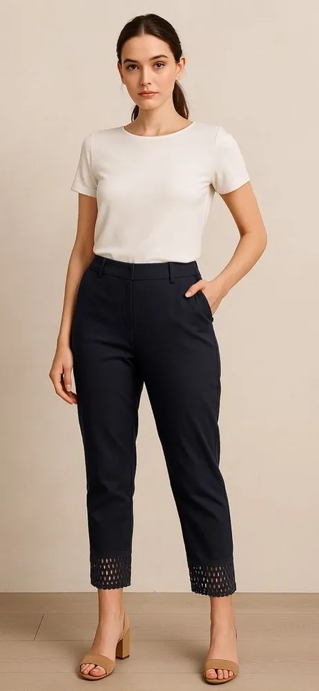 Refresh your wardrobe with these stylish Zac & Rachel cropped pants in a rich navy shade, featuring a statement-making 100% cotton crochet trim at the hem. The pull-on design is crafted from a soft, comfortable rayon blend, offering a flattering fit and effortless style for work, travel, or casual everyday wear. The chic navy color and decorative hem make these versatile trousers ideal for mixing and matching with any top or accessory. Key Features: • Brand: Zac & Rachel • Color: Navy • Size: 12 • Material: 76% rayon, 20% nylon, 4% spandex (body); 100% cotton (crochet trim) • Cropped length with crochet hem detail • Faux back pockets, comfortable pull-on waist • Perfect for work, travel, and casual outings Why you’ll love them: Timeless navy color, on-trend crochet detail, and comfortable fit for year-round wear. Measurements: Waist: 16.5” measured flat Inseam: 21” Length: 33” Rise: 10.5”